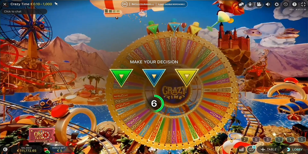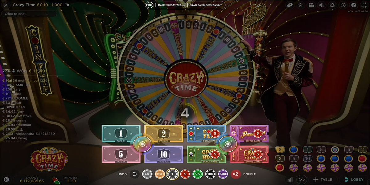 Speel Crazy Time, het populaire live casino spel, bij online casino’s die Belgische spelers accepteren. Met bonusspellen en grote vermenigvuldigers.