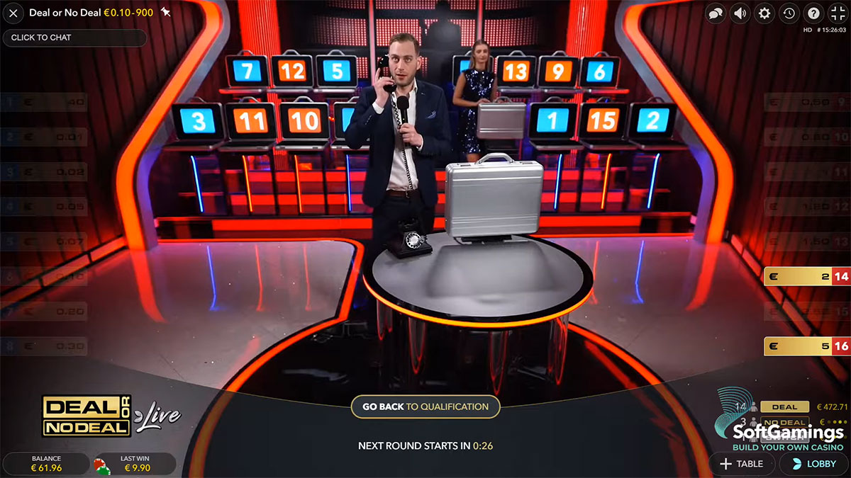 Deal or No Deal Live van Evolution werkt als een interactieve live spelshow, niet als een conventionele gokautomaat, en combineert realtime actie in de studio met digitaal wedden. Elke ronde begint met een inzetvenster, waarin spelers inzetten plaatsen op hun favoriete segmenten of op toegang tot het hoofdspel. Het spel bevat 16 genummerde koffertjes, die elk een verborgen geldprijs bevatten, variërend van kleine bedragen tot grote jackpots. Spelers kijken toe hoe een live croupier of presentator het kwalificatiemechanisme in werking stelt, vaak een digitale kluis of een RNG-spin, om te bepalen welke deelnemers doorgaan naar de hoofdronde, wat een mix van strategie en toeval in elke sessie garandeert.