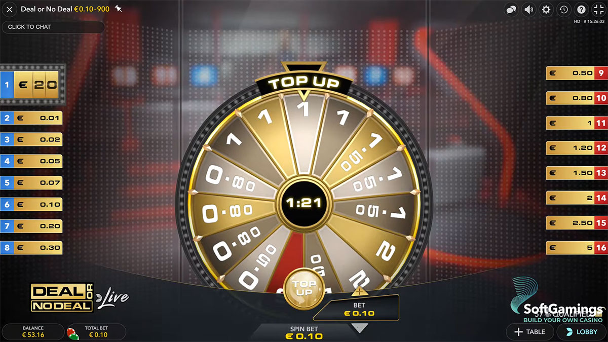 De belangrijkste aantrekkingskracht van het spel Deal or No Deal Live van Evolution ligt in de geïntegreerde bonusmechanismen, die rechtstreeks verbonden zijn met het hoofdspel, in plaats van in de traditionele elementen die kenmerkend zijn voor gokautomaten. In tegenstelling tot spellen die op rollen zijn gebaseerd, worden de bonussen geactiveerd via de aanbiedingen van de bankier en top-up-vermenigvuldigers, wat elke ronde extra strategie en spanning toevoegt. Terwijl spelers koffertjes openen, kan het spel een top-up-ronde activeren, waarbij geselecteerde koffertjes worden opgewaardeerd met vermenigvuldigers, wat hun prijswaarde verhoogt en deelnemers de kans geeft om aanzienlijk meer te winnen dan hun oorspronkelijke inzet. Deze vermenigvuldigers brengen onvoorspelbaarheid en hoge volatiliteit in het spel, omdat zelfs kleine inzetten tot aanzienlijke uitbetalingen kunnen leiden als de top-up wordt toegepast op een koffer met een hoge waarde.