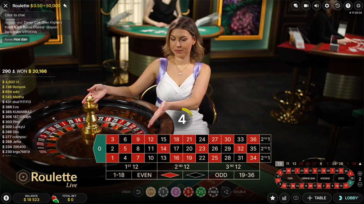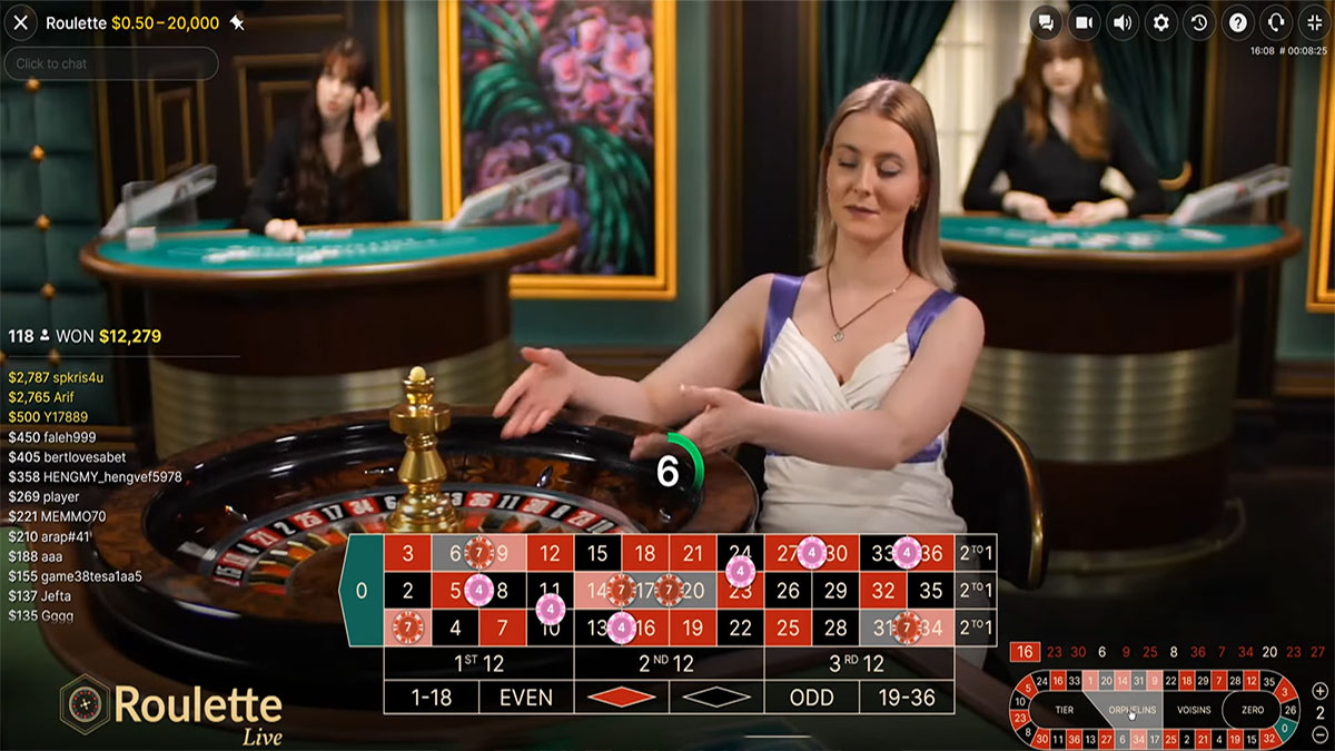 Vanuit analytisch oogpunt komt het ontbreken van bonusvermenigvuldigers in feite ten goede aan spelers die op zoek zijn naar stabiliteit. Zonder willekeurige verhogingen van de winsten, die de volatiliteit zouden beïnvloeden, behoudt het spel een consistente variantie die strikt gebaseerd is op de gekozen soorten inzetten. Spelers die van risico houden, kunnen kiezen voor directe inzetten op nummers met een uitbetaling van 35:1, terwijl conservatieve spelers kunnen vasthouden aan even-money-inzetten voor stabielere opbrengsten. Het ‘bonus’-element zit dus niet in toegevoegde mechanismen, maar in de flexibiliteit, het realisme en de vloeiende kwaliteit van de livestream.